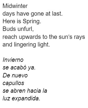A blogger whose posts I enjoy is Rebecca, of Fake Flamenco fame. She keeps her curious eyes open, as she walks and explores the natural world and other things that attract her notice. She informs herself and then her readers about social and political issues in Latin America -which I find so interesting as this is very little covered here in the UK. And she’s a poet. Every month she throws out a poetry challenge, which I always try to join in on, because she translates every poem that’s submitted into Spanish. There’s something very special about this. That she would spend time reading our work, then interpreting it faithfully, and in the same poetic style as our own efforts is quite wonderful.