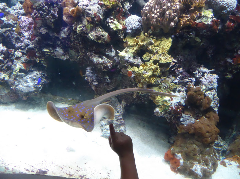 When we finally left them to it, we discovered we hadn’t finished with pulsing creatures. Here was a Blue Spotted Ribbon-Tail Ray. He gently wove round the tank, his flat body slowly rippling to the rhythm of his inner pulse.