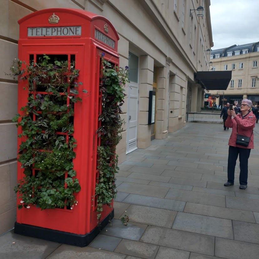 The plain truth is that these days, in the UK at least, a phone box rarely has a phone within. They have become so iconic that many remain in situ. They’re often re-purposed as community book exchanges (Grrr. No photo!), or as a community planters – spotted in Bath with Becky herself, and Anabel, aka The Glasgow Gallivanter, who wants her own photo of it.