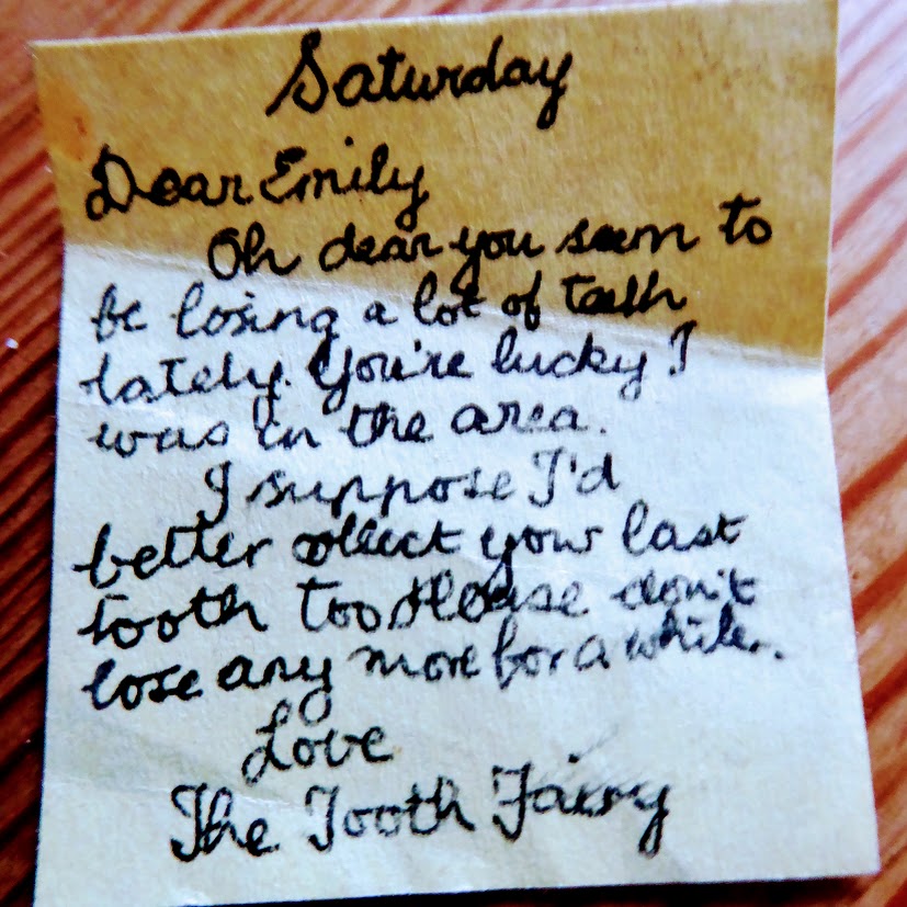 Finally, here’s a genuine letter written by the tooth fairy who visits the children in our family when they lose their baby teeth. She’s a grumpy soul. She writes messages on tiny pieces of paper the size of a postage stamp and tucks them under the pillow as she leaves her silver coin. A Red Letter Day for the lucky recipient.