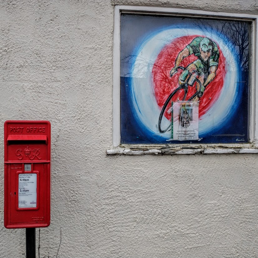 Then there’s our local post box, still with an image painted on the wall behind dating from 2014, the year we moved here, and the year that the Tour de France started in Yorkshire, and passed through the village. And in a nearby village, the box dates from the reign of Queen Victoria. Look! ‘VR’: Victoria Regina. And finally, a box spotted last autumn topped off with yarn bombing for Hallowe’en.
