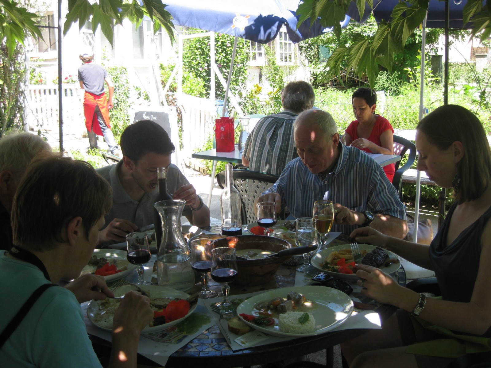 Today then has been a day of careful research in advance of Sunday’s ‘fly past’. There was a planning meeting at a nearby restaurant, ‘La Maison’, over copious and varied hors d’oeuvres, blanquette d’agneau and bavarois de framboises to decide what we should choose as our vantage point for the action.