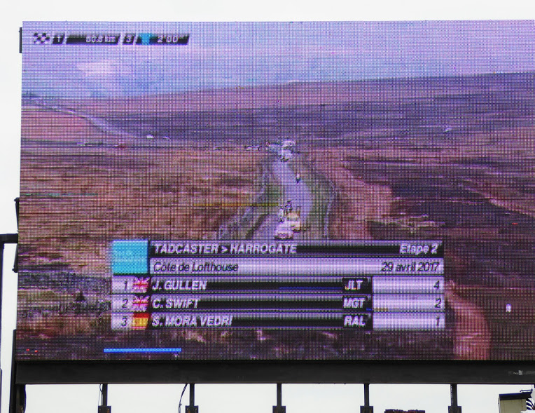 During the afternoon though, I sauntered into West Tanfield to watch the Men’s Race. I arrived to find a party atmosphere. There, amongst all the stalls on the village field, was the Big Screen showing the progress of the Tour in real time. Just look though. Just as in ze Tour de Fraunce, everysing eez in Frainch. ‘Tour de Yorkshire’, ‘Le Côte de Lofthouse’, ’29 avril 2017′. It’s a sweet little homage to the Tour de France, without which …..