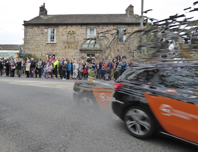 As the Big Screen informed us the riders had reached Masham, we started to line the streets. Volunteer Tour Makers shooed us onto the pavements, and we waited …. First of all, police motor bikes. Then this vehicle, complete with Man with Microphone. ‘Allez, allez allez’, he yelled. ‘Oi! Oi! Oi!’, we yelled back. ‘Allez, allez, allez!’ ‘Oi! Oi! Oi!’. ‘Allez!’ ‘Oi!’, ‘Allez!’ ‘Oi!’ ‘Allez, allez, allez!’ ‘Oi! Oi! Oi!’