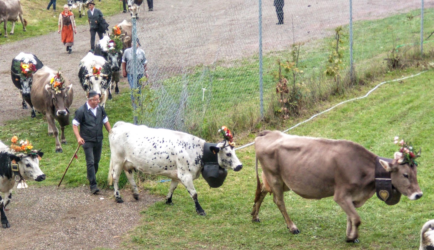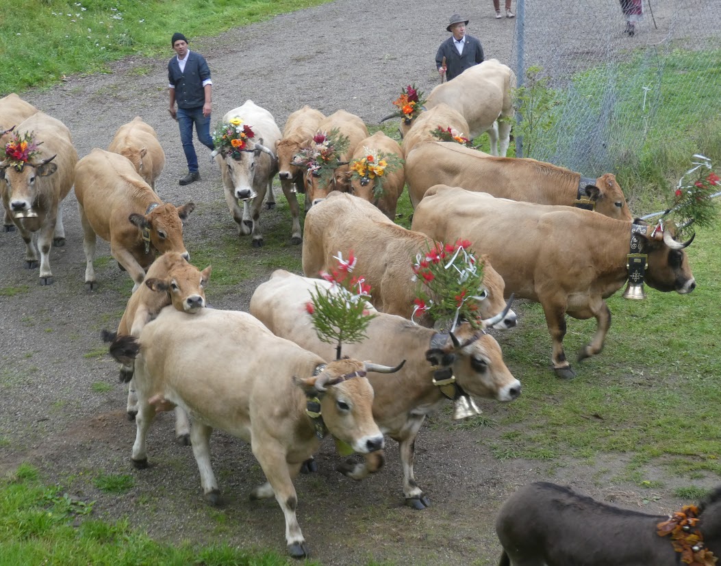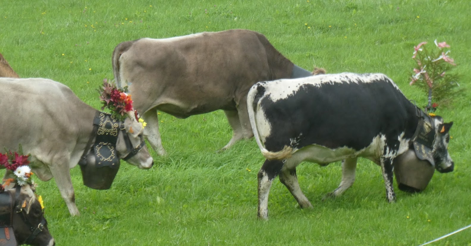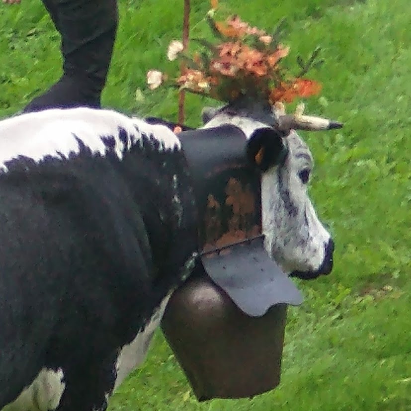 Then finally, we could hear all those cowbells clanging away, announcing that the cows were on their way. In truth the cows weren’t happy, and many of them skittered nervously about. I don’t know how much the leading cows enjoyed their fancy headdresses either: but they didn’t complain. By now it’ll be over, and they can forget all about it till next spring, when they’ll be off up the mountain again.