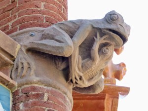 This was a Christian foundation. Nuns provided nursing care until the 1990s, as they had done since the hospital’s earliest years Mosaics in the building told stories from the Christian tradition, such as that of Saint George slaying the dragon. Other carvings and statues relied on ancient legends. This frog nursing a baby frog, for example, is an old symbol of caring love.